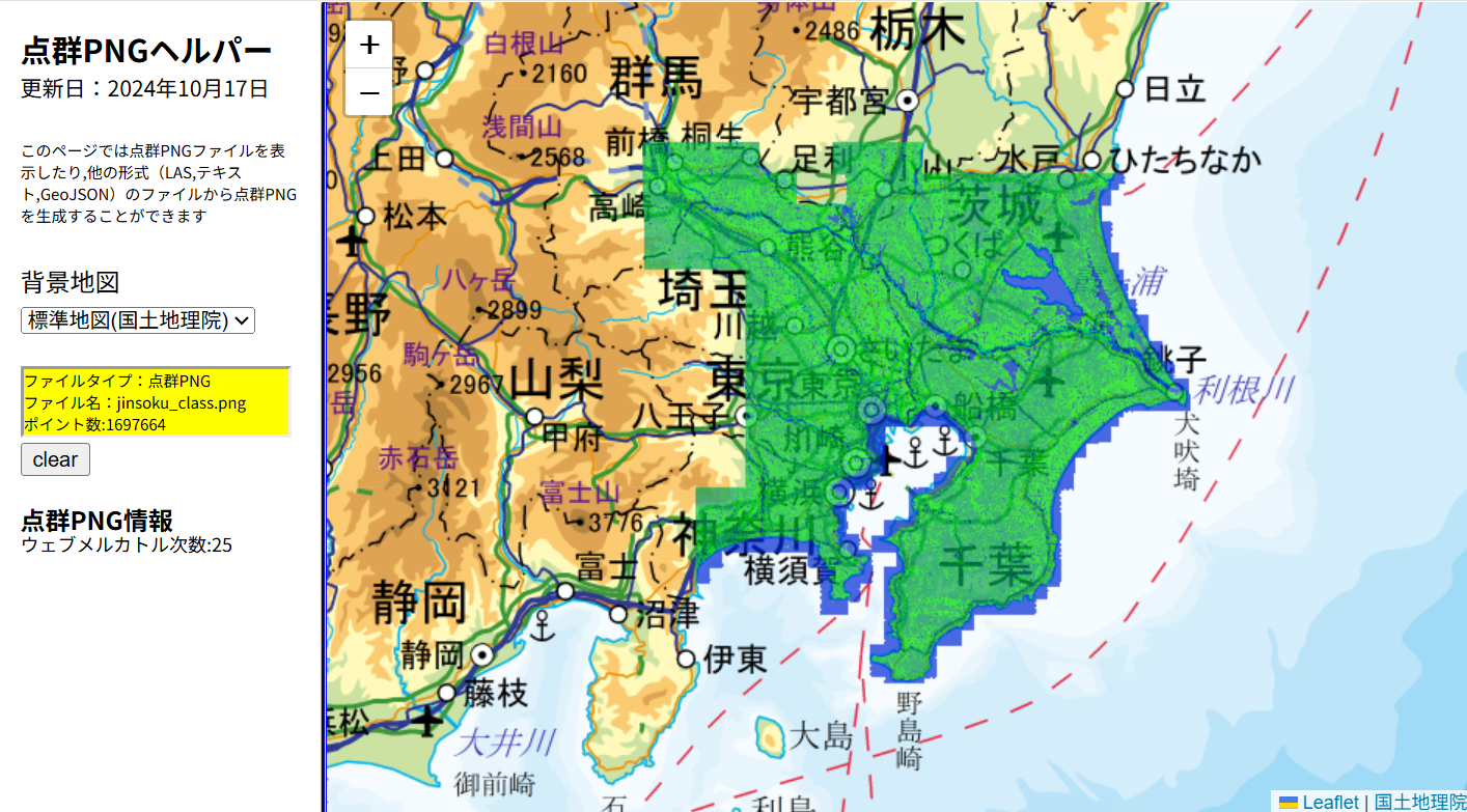 迅速測図点群PNG(1,697,664点,833KB)オリジナルのGeoJSONファイルのサイズが約381Mbですので,それに比べると約0.22%(約1/457)の大きさまで縮小されています.